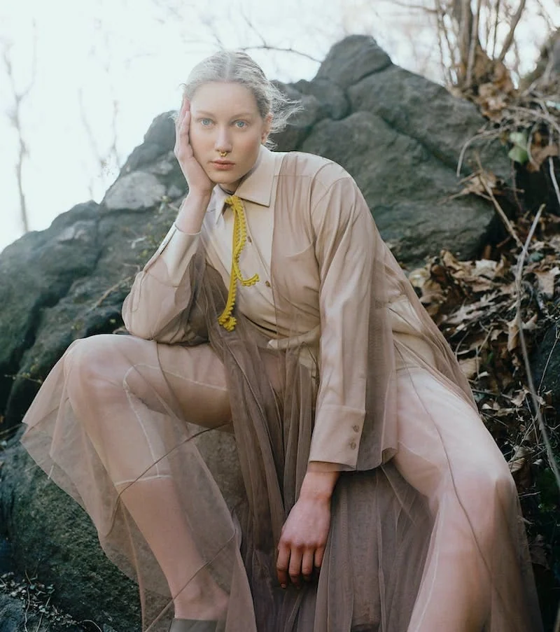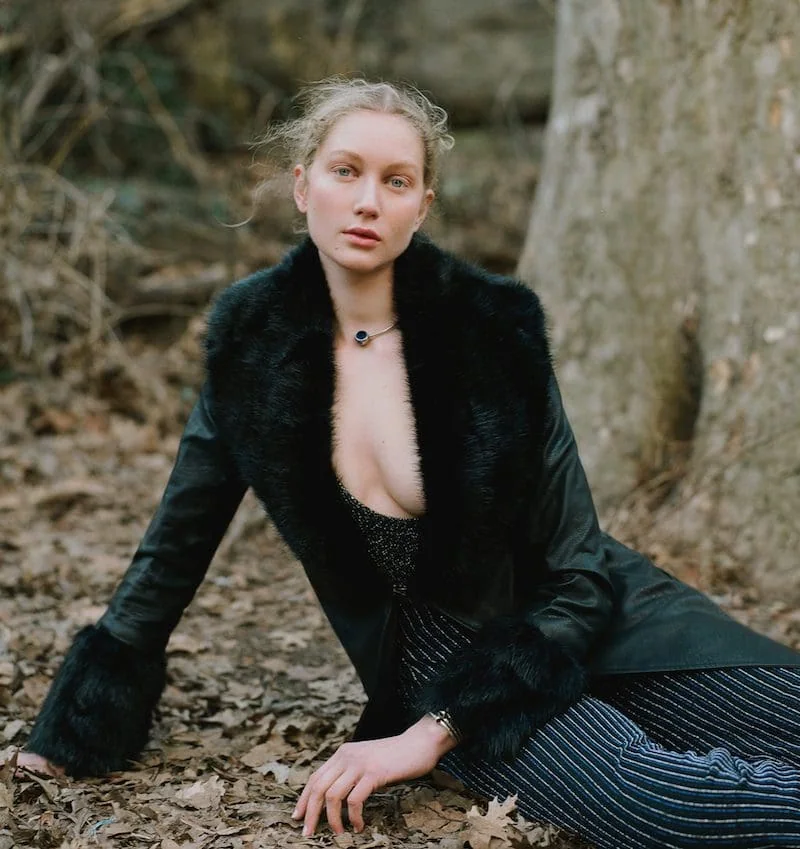 Stylish, high-quality image emphasizing fashion and sophistication, ideal for fashion SEO. Stunning Monica Varela model in stylish black coat with fur details, sitting on leaf-covered ground in nature setting. Beautiful Monica Varela outdoors in sheer beige layers.