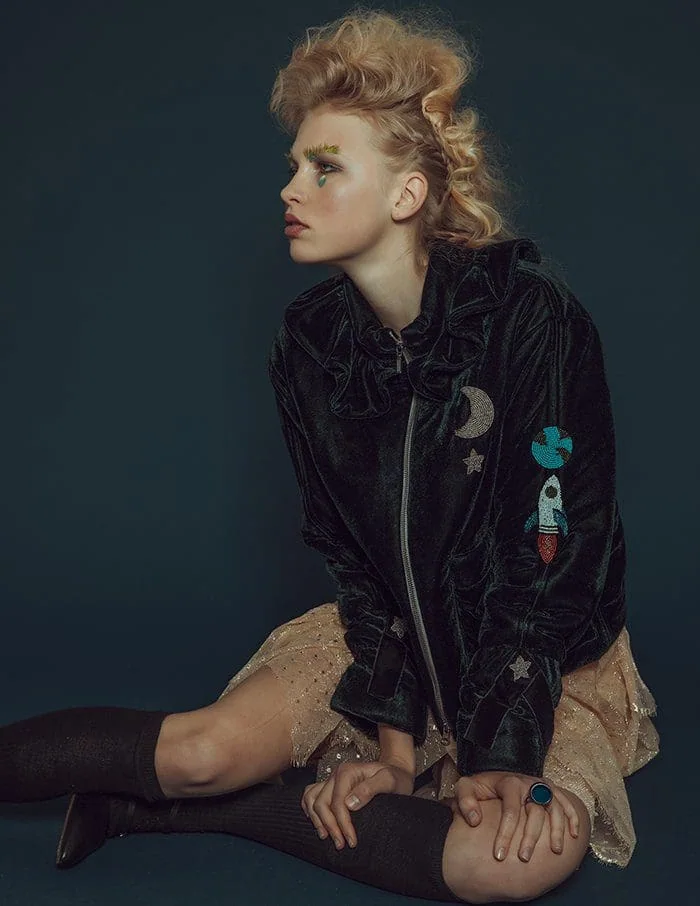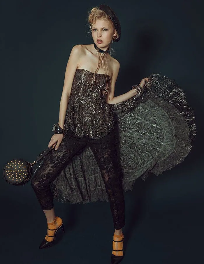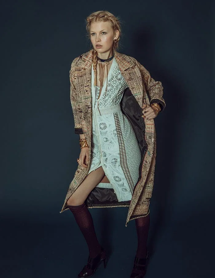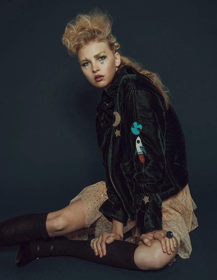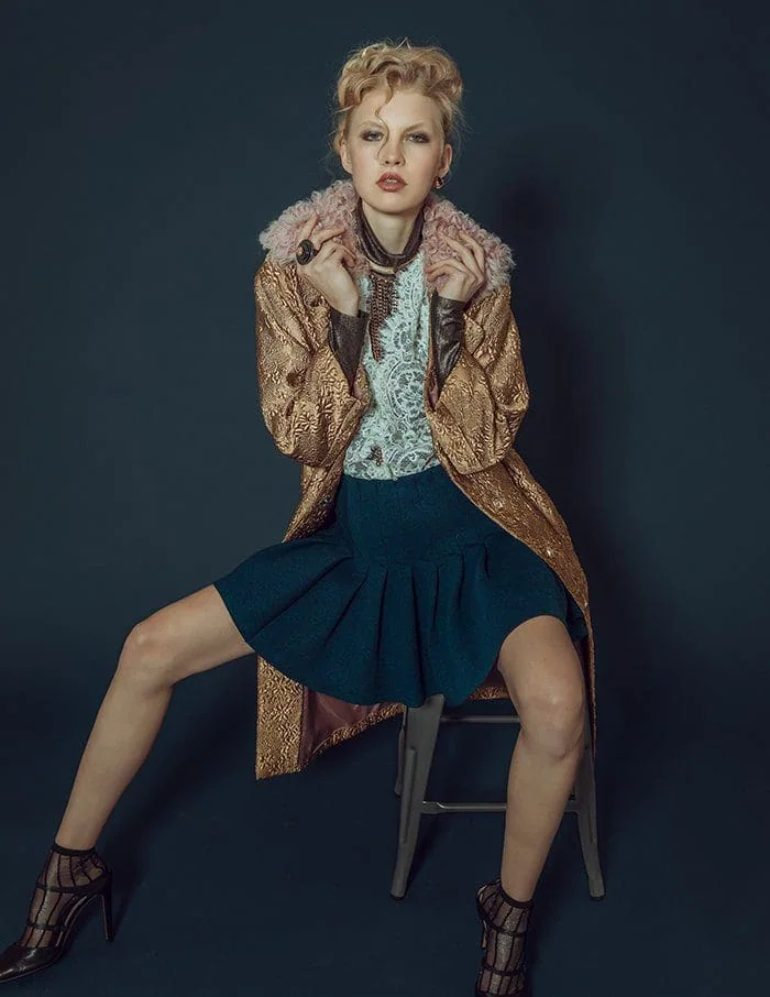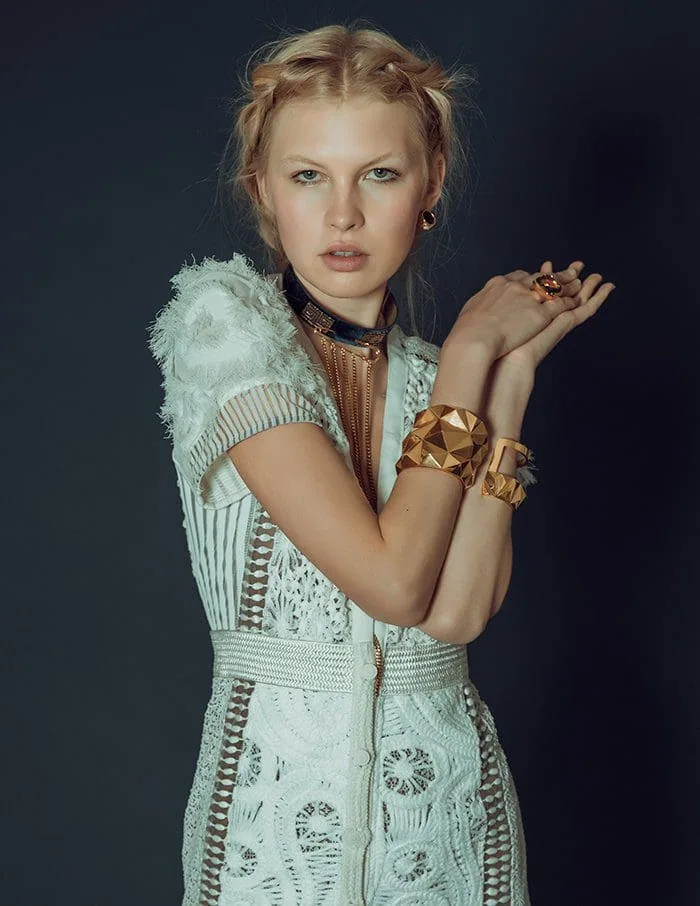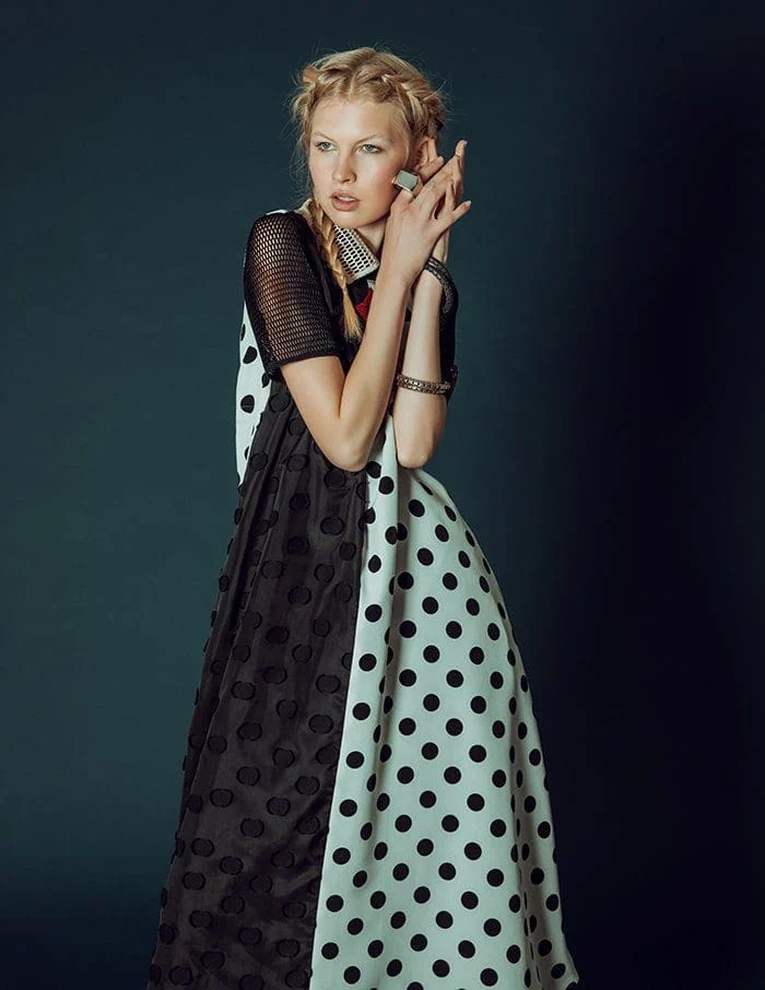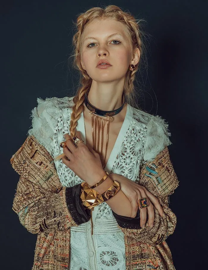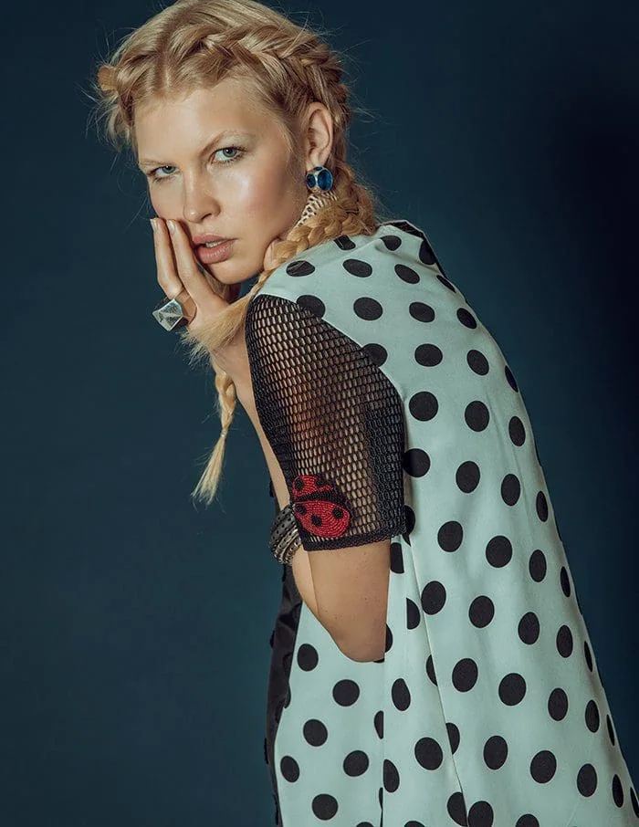 Beautiful portrait of Monica Varela with stylish polka dot dress. Monica Varela wearing a fashionable polka dot dress with accessories. Fashion model wearing ornate gold coat with pink fur collar, stylishly posed for Vogue. Elegant woman in chic clothing and high heels, striking a confident pose against dark background. Elegant woman wearing designer jewelry and stylish bohemian clothing with braided hair. Beautiful woman in stylish coat, lace dress, and high boots posing confidently against dark background. Stunning image of Monica Varela wearing gold jewelry and a detailed lace dress, emphasizing contemporary fashion and jewelry trends. A stylish woman with braided hair, wearing a polka dot dress and fishnet sleeve, striking a confident pose. Youth fashion, creative makeup, and stylish outfit for editorial photos. Stunning model Monica Varela showcases edgy, luxurious fashion with lace, accessories, and striking shoes. Stunning woman with curly red hair, wearing jewelry in a professional photoshoot. Close-up of Monica Varela in stylish, metallic outfit with bold makeup and accessories. Stunning Monica Varela wearing lace dress with accessories for Bouace Magazine. Elegant fashion portrait of Monica Varela showcasing her unique style and vibrant look, perfect for Bulace Magazine.