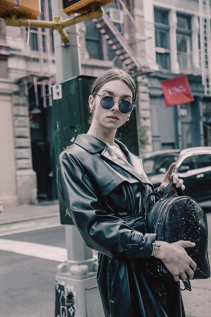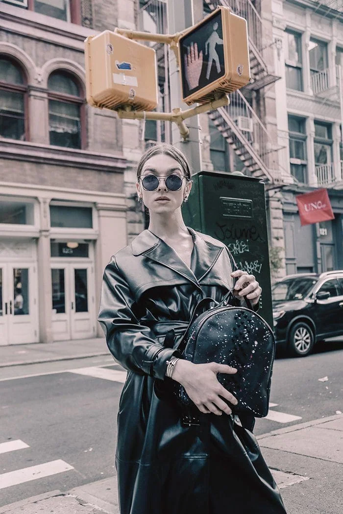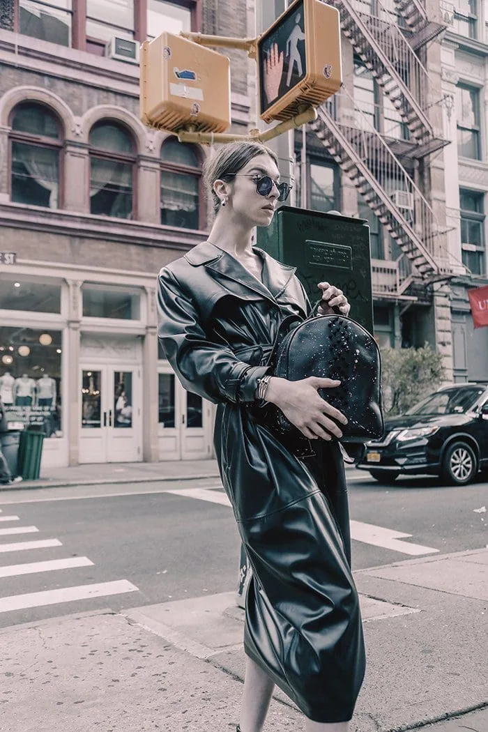 Trendy city fashion featuring a woman in a leather trench coat with space-themed accessories.