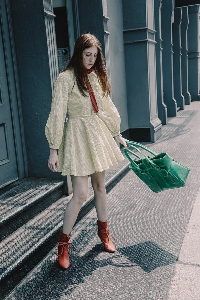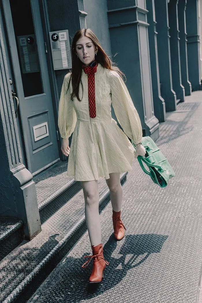 Fashionable urban street style with Monica Varela, featuring a stylish dress, red boots, and green handbag.