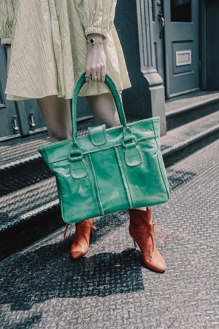 Chic street style featuring a woman with a vibrant green handbag and trendy boots on urban steps.