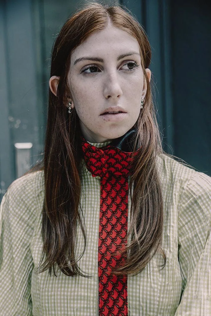 Fashionable woman with long red hair, wearing a patterned shirt with a red scarf, in an urban setting.