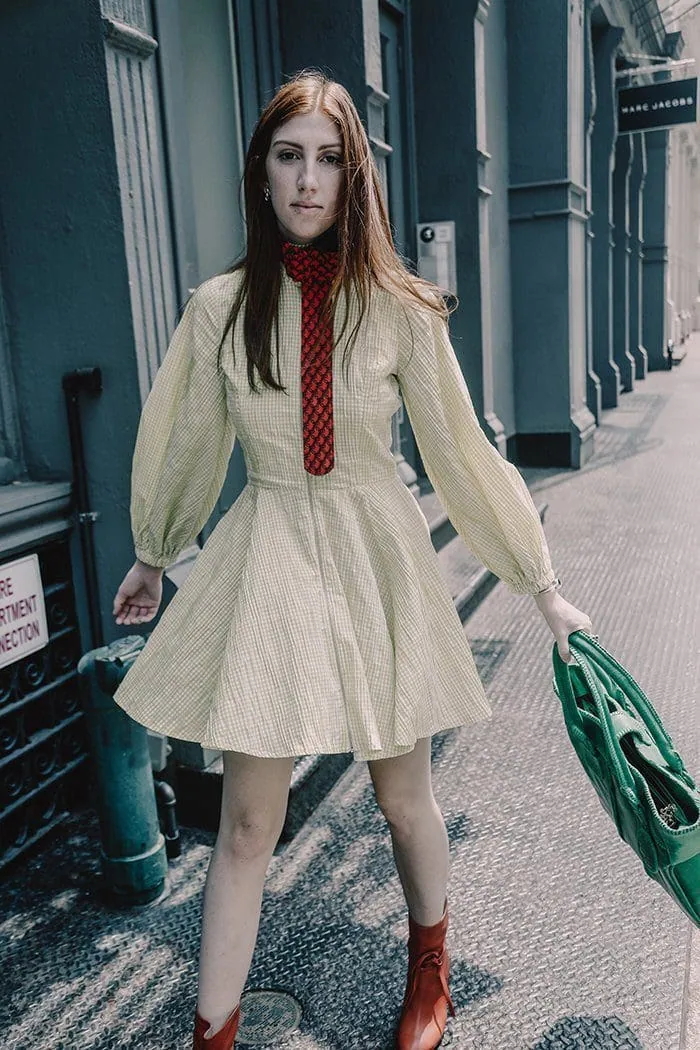 Monica Varela showcases trendy street fashion with a yellow dress, red accessories, and a green bag in an urban setting.