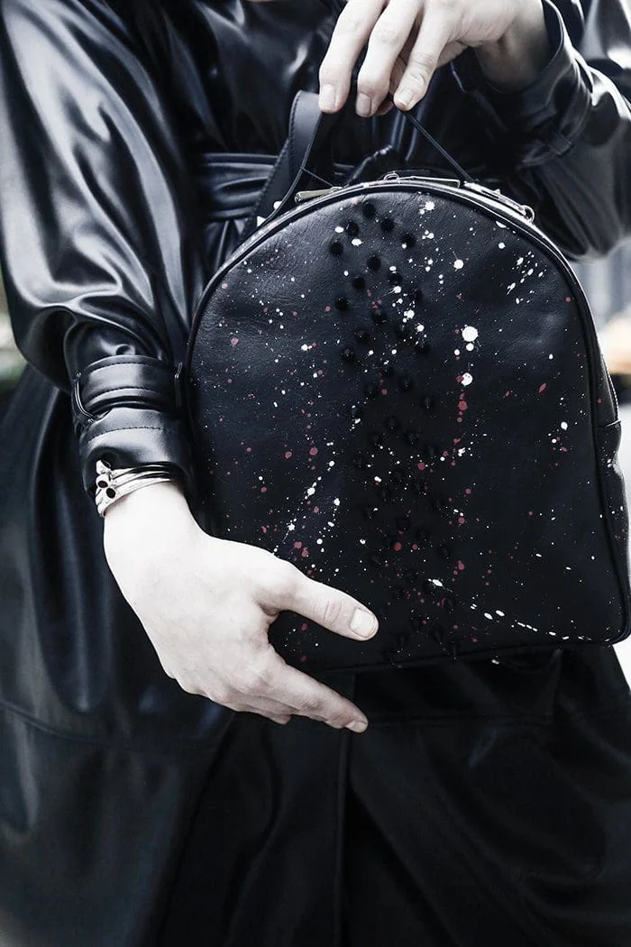 A trendy black backpack featuring a starry splatter design and black pom-poms, ideal for fashion lovers.