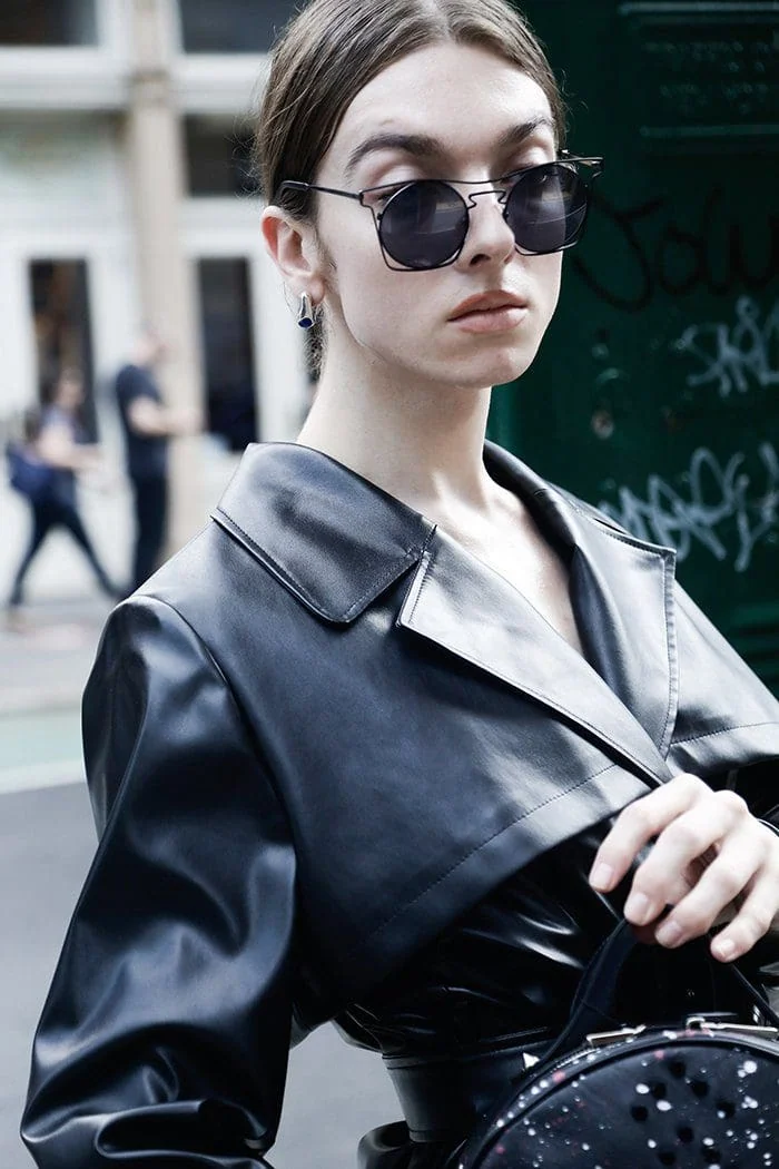 Fashion-forward Monica Varela in urban chic outfit with leather jacket and sunglasses outdoors.