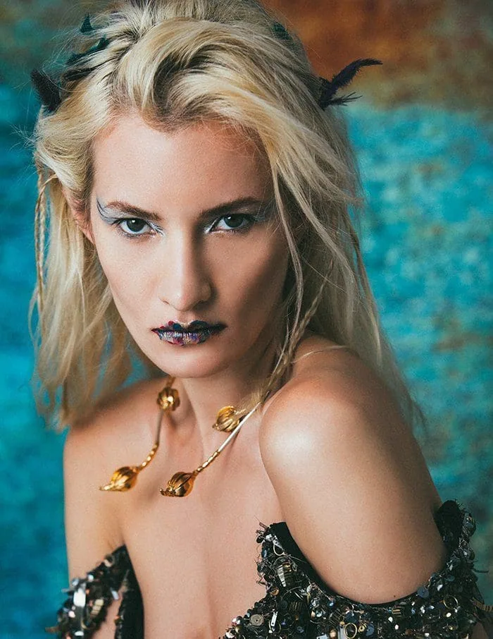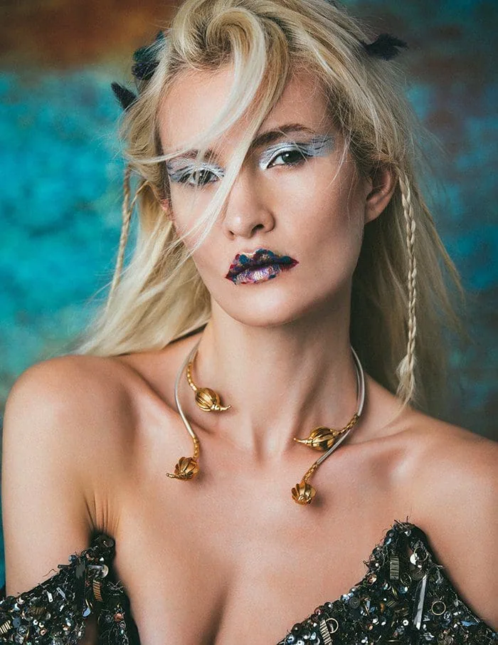 Stunning portrait of model Monica Varela with creative makeup and jewelry, perfect for fashion photography and editorialUse. Vivid portrait of Monica Varela showcasing avant-garde makeup, statement jewelry, and a glamorous sequin outfit. Varela Monica with bold makeup and unique style, showcasing fashion and beauty.