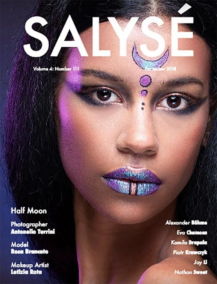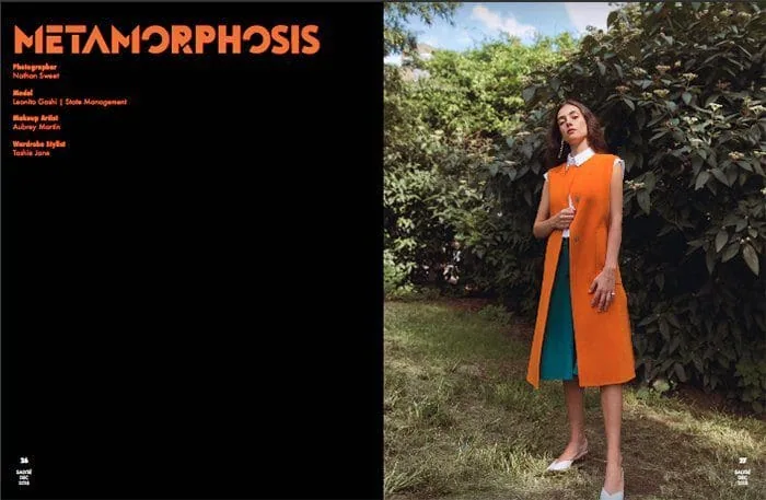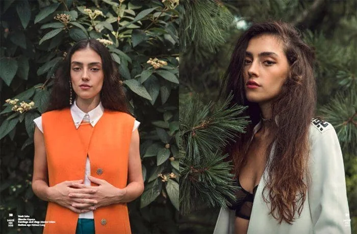 Elegant model Monica Varela on cover of Salysé Magazine wearing vibrant orange vest and white shirt. Young woman with wavy hair in nature setting, stylish outfit and confident expression. Elegant portrait of Monica Varela outdoors, showcasing stylish orange and teal dress for fashion feature. Stunning Monica Varela featuring bold makeup and artistic visuals on Salysé Magazine cover.